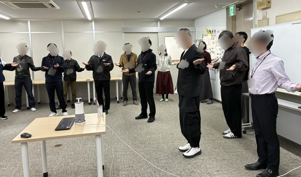 名古屋眼鏡株式会社では健康経営の一環で、全体朝礼中にストレッチの時間を設けております。