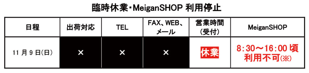 さてこのたび弊社では、電気設備交換工事の実施に伴う全館停電のため、下記の通り営業を臨時休業し、併せて弊社WEBご注文システム「MeiganSHOP」のご利用を一時停止させていただきます。